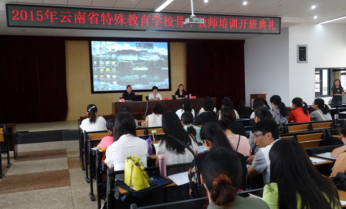 为进一步夯实我省特殊教育学校骨干教师专业知识技能,促进特殊教育事业发展,6月27日,2015年云南省特殊教育学校骨干教师培训开班典礼在我校惟行楼5301室举行,昆明市盲哑学校校长杨志成、教师教育学院院长唐敏、教师教育学院副院长李里以及全省120名特殊教育学校骨干教师参加了此次开班典礼,开班典礼由李里主持。