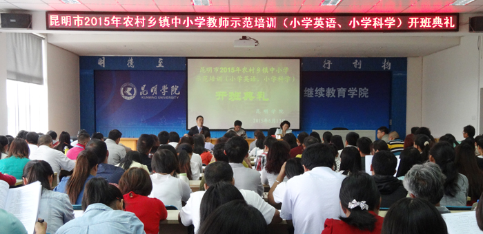 6月13日上午,昆明市2015年农村乡镇中小学教师第二期示范培训小学英语、小学科学教师培训班在昆明学院昆师路校区继续教育学院举行开班典礼。来自昆明市各县(市、区)及滇中产业新区安宁、嵩明、空港经济区农村乡镇小学的103名英语教师和103名科学教师,将按学科分班进行为期7天的集中培训。