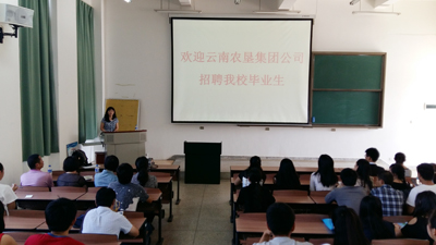招生就业处处长包兴偕同集团公司人事部秦燕部长及下属8家企业人员来到博雅楼2103多媒体教室, 包兴首先向同学们简单介绍了集团公司的基本情况,同时要求同学们自信、自强,充分展示昆院学子风采,积极应聘、主动应聘;秦燕详细介绍了集团公司的发展历史,集团公司是云南省人民政府授权省国资委管理的省属国有重要骨干企业,是以天然橡胶生产为主,电力、商贸物流等多产业共同发展的大型集团。集团总部位于云南省昆明市,下辖二级企业28户,是云南省农业企业中唯一的国有大型骨干企业。她表示,集团公司非常重视人才队伍建设,也深深懂得,实现农垦梦,人才是关键,诚恳欢迎昆明学院的学生来集团公司工作,为云南农垦奉献青春和智慧。