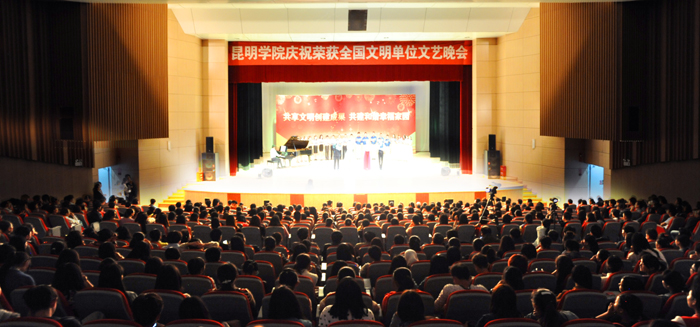 演出前,何华致辞。他首先感谢全校师生在学校创建全国文明单位各项工作中所付出的辛勤劳动,称赞全体师生为学校的建设发展团结一心的实干奉献精神。他说,全国文明单位称号,是在精神文明建设领域取得突出业绩的国家级最高荣誉,这也是我校获得的继全国“六五”普法中期先进单位之后又一重要成果和殊荣,是我校文明单位创建活动扎实推进、创新发展的又一丰硕成果,是全校师生的光荣与骄傲,标志着我校文明创建工作取得了历史性突破——跻身全国文明单位的最高荣誉榜。昆明学院有幸荣获全国文明单位荣誉称号,是对我校创建文明单位工作的肯定与褒奖,同时也是对我校今后建设发展中的激励与鞭策。他指出,荣获全国文明单位荣誉称号,与上级主管部门和社会各界的大力支持分不开;与学校党政领导班子的高度重视分不开;与全校师生齐心合力、努力工作分不开。何华强调,今天所取得的成绩与荣誉,是激发和推动昆明学院各项事业不断进步发展的基石与动力,他希望全校师生以此为契机,戒骄戒躁,再接再厉,为进一步推动学校全面建设发展再续辉煌。