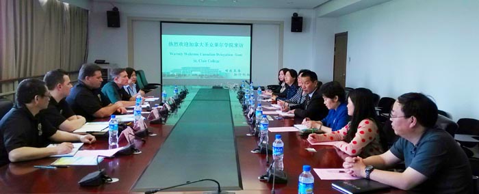 4月16日下午,加拿大圣克莱尔学院副校长Ron Seguin先生一行访问我校,随行的有国际部主任Peter Bondy、注册官 Mike Silvaggi、国际部招生及项目发展经理巫春涛、圣克莱尔学院中国校代荣燕女士。我校副校长李翔、熊晶率国际交流合作处、外国语学院、旅游学院、农学院和教师教育学院相关领导热情接待并与之会谈。