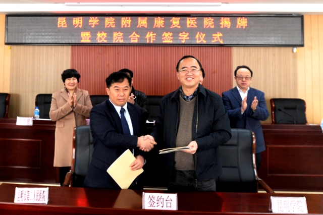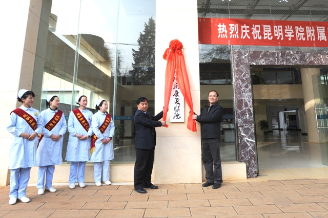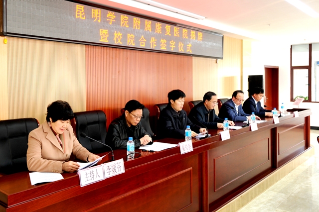 2月12日上午,昆明学院在昆明市第二人民医院多功能厅举行昆明学院附属康复医院揭牌仪式,开启了昆明市第二人民医院与昆明学院院校合作新篇章。我校校长蒋永文,党委副书记、纪委书记李媛芬,昆明市政协副主席、昆明市卫生局副局长常敏,省教育厅高教处处长王永全,云南省卫计委科教处处长黄兴黎,昆明市第二人民医院党委书记杨雨春、院长毕卫红,我校校办、科研处、招生就业处、医学院负责人,昆明市第二人民医院有关部门负责人和医务人员代表参加了揭牌仪式。