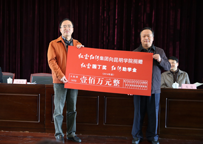 仪式上,范晓厂长代表红云红河集团昆明卷烟厂向昆明学院捐赠100万元奖教助学金,蒋永文校长代表昆明学院接受捐赠。