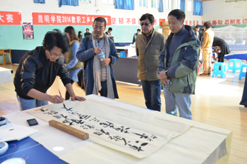本次比赛评委邀请教职工书法协会冯坚、党委宣传部何明松、人文学院贾斌等人担任。参加活动的还有教务处处长沈凡,副处长王宝玲、王韬,校工会副主席刘宇红以及比赛特邀评委昆明学院教职工书法协会会员等。