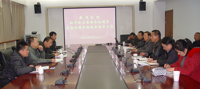 根据昆明经济技术开发区安全生产委员会关于开展2014年度安全生产工作考核的安排和要求,12月30日下午,由经开区安监局局长税康生带队,安监局和综合执法局一行5人组成的督查组对我校2014年安全生产、消防、道路交通工作进行综合督查考核。学校分管副校长李翔,保卫处处长方永昆、副处长孙丽、后勤集团副总经理曹全科以及保卫处科以上干部参加考核。考核会在311会议室进行,考核分听汇报、查台帐、看实地三个环节进行。