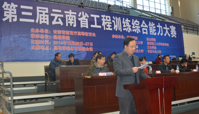 由云南省教育厅主办,我校自动控制与机械工程学院承办的云南省第三届大学生工程训练综合能力竞赛于12月27日在我校体育馆综合馆举行。校长蒋永文出席开幕式,教务处处长沈凡,自机学院党总支书记熊绍宏,院长毕涛,副院长陈玲、陈为民和来自各参赛院校的相关领导、专家、选手参加了开幕式。蒋校长代表昆明学院致欢迎词,孙学强老师代表裁判员、陈林飞代表参赛选手进行了宣誓,开幕式由毕涛主持。