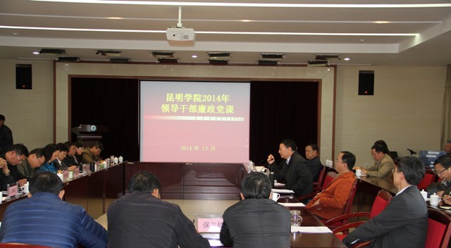 12月3日下午,昆明学院2014年领导干部廉政党课在办公楼502会议室举行,学校党委书记陈世波为党员干部上党课。陈书记围绕党要管党、全面从严治党主题,结合党的十八届四中全会、省委九届九次全会和习近平总书记系列重要讲话精神及党的群众路线教育实践活动的要求,理论联系实际,深入阐述了新常态下从严治党、加强干部队伍建设的理论意义和实践要求,并提出了学校贯彻落实相关会议和讲话精神,推进依法治校、加强党的建设的思路和举措。校长蒋永文,党委副书记孙勇,副校长熊晶、郭华、刘海发等校领导、中层干部和党员参加听课学习。
