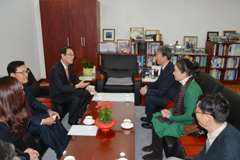 11月28日,我校代表团到金浦大学考察交流。一进校园,代表团就被悬挂在办公楼上方的“欢迎昆明大学代表团访问我校”的横幅所感动。金浦大学Nan Ilho校长率国际教育院院长、会计室主任、教务处处长、宣传部部长、产业处处长、事务处处长、烹饪科科长和学前教育科科长参加会谈。Nan Ilho校长表达了去年访问昆明学院时留下的美好印象。他强调,中韩两国一直有产业、文化交流的传统,特别是今年习主席来韩访问,给双方自由贸易带来很大促进。在此氛围下,我们两校一直在努力,希望会谈可以进一步推进双方的合作交流。Nan Ilho校长还简要介绍了学校情况,他强调金浦大学的23个学科中,酒店科、理科和幼儿教育科位居全国前列,幼儿教育科在2014年获得最优排名。学校特别重视留学生教育,有来自17个国家和地区的留学生230余名,其中中国留学生50名。