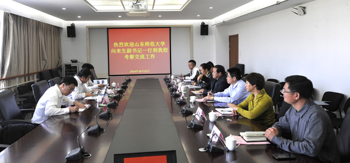 10月21日下午,山东师范大学副书记向来生、党办副主任毕研强、团委副书记史志远一行3人到我校考察交流。我校党委副书记孙勇,校长助理郑克刚及党办、组织部、宣传部、监察审计处、团委等部门负责人与来宾在办公楼411会议室进行交流座谈。
