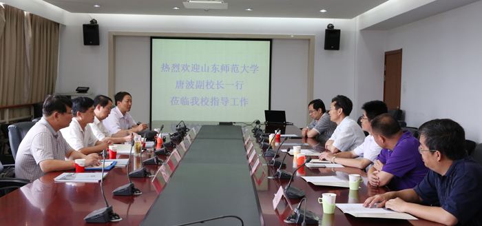 7月29日上年,山东师范大学副校长唐波率学校图书馆、信息技术处相关负责人一行5人到我校就图书馆建设进行考察交流。我校副校长刘海发接见唐波副校长一行,并介绍我校改革发展情况;校长助理郑克刚及校办、图书馆、现代技术教育中心负责人参加交流活动。