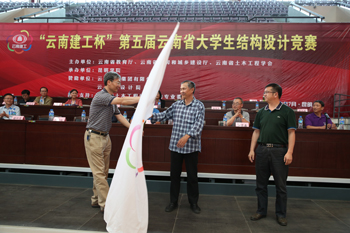 颁奖仪式后,举行承办单位交旗仪式。“云南建工杯”云南省大学生结构设计竞赛主办单位代表云南省教育厅高教处调研员谢怀昆宣布,第六届竞赛承办单位昆明理工大学,并从第五届竞赛承办单位昆明学院副校长董建华手中接过会旗,交到第六届竞赛承办单位昆明理工大学副校长牛治喨手中。牛副校长接过会旗后挥旗示意,并代表第六届云南省大学生结构设计竞赛承办单位欢迎各高校选手2015年相聚昆明理工大学。
