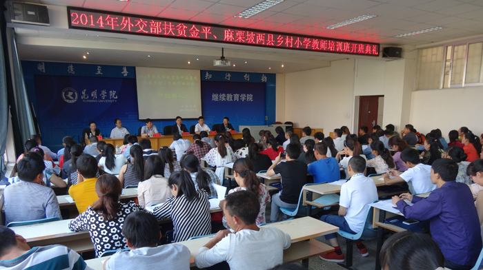 4月20日上午,2014年外交部扶贫云南金平、麻栗坡两县乡村小学教师培训班在我校继续教育学院开班,来自两县的100名小学教师将接受为期12天的培训。省政府外事办公室副主任王伟、我校副校长刘海发、省政府外事办公室人事处及我校继续教育学院的相关领导参加开班仪式。王伟副主任、刘海发副校长分别在开班仪式上作动员、提要求、话期望。开班仪式由继续教育学院院长陈嘉主持。