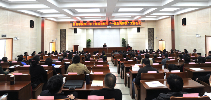 “一报告两评议”是干部工作中的一项常规工作,学校按照省委《关于做好2013年干部选拔任用工作“一报告两评议”有关事项的通知》召开干部大会,首先,陈世波书记作《昆明学院2011年11月以来选人用人工作情况报告》;接着,对2011年11月以来党委干部选拔任用工作情况和新提拔任用的正处级干部进行评议。