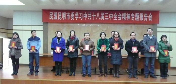 12月20日,民盟昆明市委在五华区政府四楼多功能厅召开中共十八届三中全会精神专题报告会,民盟昆明学院总支10名盟员代表聆听了中共昆明市委宣讲团成员、市委政策研究室龚志龙主任对十八届三中全会精神的解读。