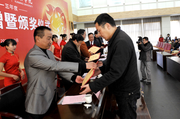 12月25日下午,昆明学院2013年度“红云园丁奖”“红河助学金”捐赠暨颁奖仪式在惟行楼1501报告厅举行。昆明卷烟厂厂长范晓、纪委书记、工会主席吴岗,学校校长蒋永文、副书记孙勇、副校长李翔、校长助理郑克刚出席,全体获奖教师、受助学生、各教学单位和相关职能部门负责人参加了仪式。仪式由李翔副校长主持。