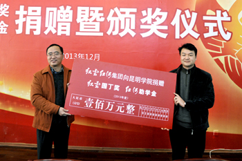 仪式上,红云红河集团领导代表集团向我校捐赠奖助学金。孙勇副书记宣读了表彰决定及名单。与会领导为获奖教师、受资助学生颁发证书。