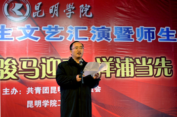 活动上,学校校长蒋永文代表学校党政领导班子向全校师生员工致新年贺词。蒋校长表示:在过去的一年里学校紧紧围绕评估整改,着力加强内涵建设,在突出办学特色、提高人才培养质量、提升教学科研水平和强化师资队伍建设等方面勤练内功,进一步深化人事制度改革和后勤社会化改革,学校各项工作都取得了可喜的成绩。共获得省级及以上教学质量工程项目128项(其中国家级项目13项),在省内同类高校中名列首位;获得国家自然、社会科学基金项目共15项,科研项目经费大幅增长,科研成果和质量显著提高;全面加强与省、市各级政府和企业的合作,充分发挥学校服务地方经济的职能,积极探索和推进“政产学研用”五位一体的应用型人才培养模式;坚持践行“把学生当孩子培养”的理念情怀,强化激励帮扶机制,8016人次的同学获得各级各类奖助学金共计1833.97万元,142名学生在各项大学生竞赛中获奖(其中:国家级奖项20项,省级奖项54项),一大批“思想品德优,理论基础实,专业能力强,综合素质高”、能动手、会创新的同学脱颖而出;进一步扩大国际交流合作,目前已和10多个国家和地区的大学签订30多个合作备忘录,留学生工作也实现重大突破,67名来自老挝、缅甸和斯里兰卡学历制留学生融入了昆明学院这个大家庭。2013年7月起,按照中央、省委的统一部署,学校深入开展了党的群众路线教育实践活动。通过学习教育、听取意见、查摆问题、开展批评、整改落实、建章立制,目前已经取得了阶段性的成果。特别是针对广大师生提出的整改意见,学校逐一落实、切实整改,及时制定和实施了一系列惠及全校师生的整改措施,师生满意度得到提高。2014年,是学校本科教育十年,学校将以“回顾、总结、提高”为主题开展一系列活动,从各方面展示宣传学校本科十年的办学成果和水平,进一步提升学校的影响力。最后,蒋校长对师生致以新年的祝福,希望大家抢抓机遇,乘着和煦的春风,朝着灿烂的前景,马不停蹄,奔腾前进,为学校发展再创辉煌!