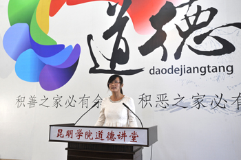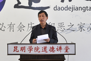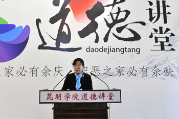 讲堂由“唱歌曲、学模范、诵经典、发善心、送吉祥”五个环节组成,紧扣学习付贵帅同学舍己救人,弘扬乐于助人的精神主题,从不同角度、不同层面讲述付贵帅高尚的道德精神,还原师生心目中真实的付贵帅。在全场人员深情齐唱《爱的奉献》后,讲堂进入学模范环节,重温由昆明电视台、昆明日报、都市时报等多家媒体联合专访付贵帅同学见义勇为事迹的新闻短片视频,再次向师生还原付贵帅同学舍己救人的壮举。观看新闻短片后,付贵帅高中、大学的同班同学张丽仙宣讲的《我的老同学》,阐述了一个积极向上、好学阳光的付贵帅;大学同班同学何俊宣讲的《我心中的付贵帅》,讲述了一个助人为乐的付贵帅;班长王智弦宣讲的《忆付贵帅》,诠释了一个热爱班级体、不是班委却胜似班委的热心同学;班主任陆晓莉老师宣讲的《怀念我的学生》,强调了帮助是他的一种习惯;父亲付世铜宣讲的《我的好儿子付贵帅》,肯定了一个孝敬长辈、体贴父母、关爱他人、珍情重义、乐于助人、热爱劳动的好孩子。在诵经典环节中,全体与会人员朗诵:“生,亦我所欲也,义,亦我所欲也。二者不可得兼,舍生而取义者也。”在发善心环节中,主持人希望全体人员激发善心,抒发善意,胸怀“厚德善行,吉祥相伴。”最后,送吉祥环节,宣讲员向全体与会人员顺序依次送上吉祥卡,告诫我们:勿以恶小而为之,勿以善小而不为。