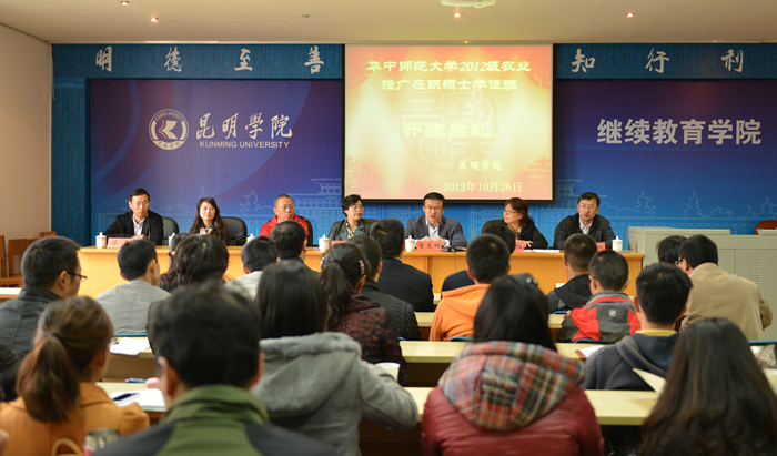 10月26日上午,华中师范大学2012级农业推广在职硕士学位班开学典礼在我校继续教育学院举行,我校熊晶副校长、华中师范大学研究生院副院长李志明、华中师范大学政治学研究院分党委书记王长华、院长唐鸣、昆明市人才办专职副主任李晋红等领导出席并讲话。开学典礼由我校继续教育学院院长陈嘉主持。