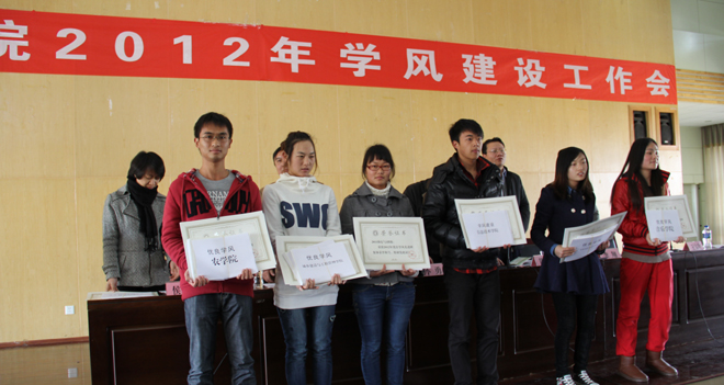 会上,刘宜萍处长宣读了《关于表彰昆明学院2012年优良学风先进个人、学风建设先进个人、优良学风先进班集体的决定》,参会领导分别为18名获奖代表进行了现场颁奖;接着教务处王宝玲副处长就我校近年硕士研究生报考、录取的工作进行了说明,对2013年学校的考研工作进行了布置安排。