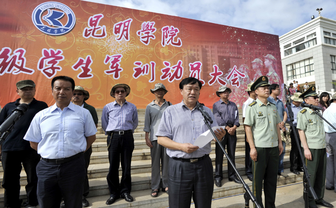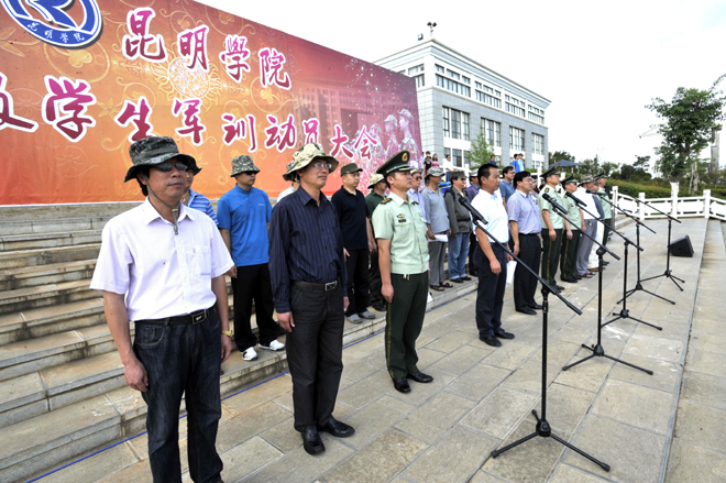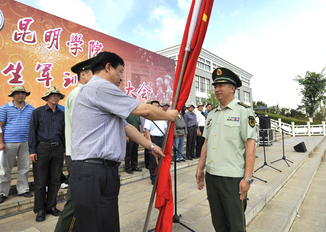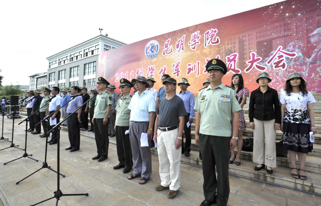 动员大会在中华人民共和国国歌声中拉开了序幕,刘宜萍处长宣布了我校2011级学生军训团组成情况。昆明学院党委孙勇副书记、武警边防部队士官学校苏强副校长向军训团授旗。