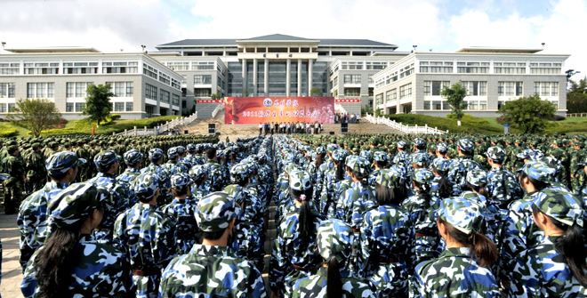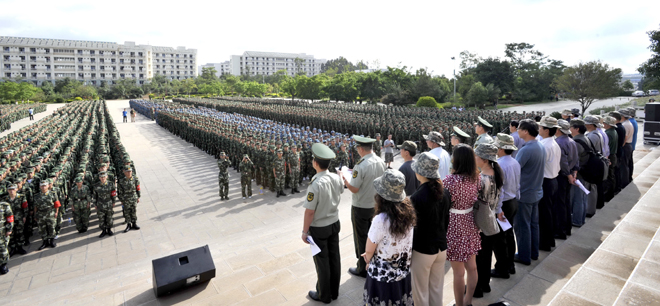 7月7日上午,我校2011级学生军训动员大会在聂耳广场隆重举行。出席开训动员大会的领导有:学校党委副书记孙勇、副校长李翔、宣传部主持工作副部长董学荣、教务处副处长王韬、学生处处长刘宜萍、保卫处处长方永昆、各院(系)主管学生工作领导,武警边防部队士官学校副校长苏强、训练部部长李荣、学生军训团团长陈应海、继续教育处处长孙利辉。各院(系)带队辅导员、全体承训官兵和2011级4865名参训同学参加了动员大会。大会由李翔副校长主持。
