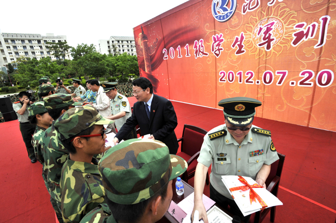7月20日上午,我校2011学生军训工作总结大会在学校聂耳广场隆重举行。武警边防部队士官学校校长符史导、训练部部长李荣、继续教育处处长孙利辉,我校校长陈世波、副校长李翔、副校长张寿国、副校长熊晶、副校长罗明东出席了大会并在主席台就坐。学校各相关职能部门以及各院(系)领导、辅导员、2011级班主任、军训团教官、2011参训学生共5000余人参加了大会。大会由李翔副校长主持。