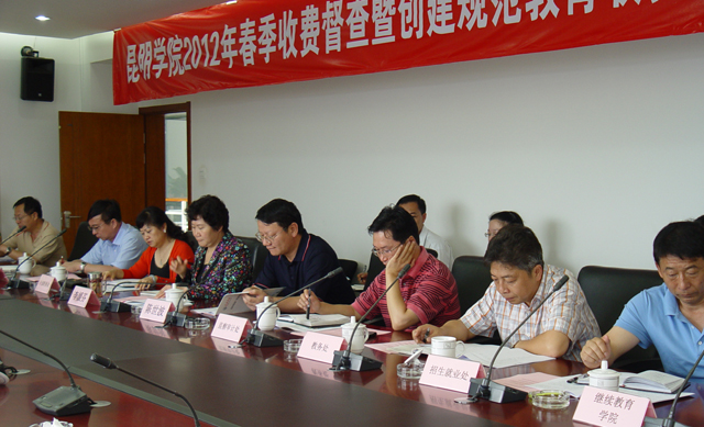 汇报会上,陈校长代表学校对考评组领导一行莅临我校检查指导工作表示欢迎。他强调,学校领导班子高度重视教育收费工作,通过合并组建四年来工作的开展,学校教育收费机制体制基本健全,干部群众对教育收费意识有较大提高,学校所有收费均严格按照程序,依法依纪规范执行,没有出现乱收费等问题。希望通过本次督查验收,进一步理顺关系,加强宣传教育,健全管理制度,进一步促进学校教育收费及管理工作。计划财务处陆志平处长代表学校向考评组作工作汇报。他从“教育收费示范高校”创建工作、2012年春季教育收费的工作、“学校预算、核算、决算一体财务管理模式”、“昆明学院收费管理系统应用示意”、“昆明学院校园服务性收费演示”等方面对学校的教育收费及管理工作进行了全面的汇报。汇报会后,考评组根据考核验收程序,进行了公告粘贴、召开座谈会、开展问卷调查、查看核实台账资料、现场走访等工作。