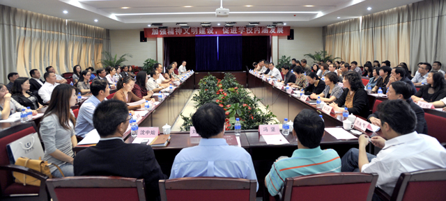 市文明办主任杨凤华作总结讲话。他指出,昆明学院是由多所学校合并而成的高等学校,创建工作难度较大,但从这次工作成绩可以看出,学校在短时间内实现了“物理整合”,正朝向“精神整合”迈进,学校要在创建省级文明单位的基础上,立足昆明、面向全国、走向世界,积极与东南亚国家合作,发展留学生教育,培养国际化人才,增强学校的国际影响力,在同级的高校中办出特色,积极创建国家级文明单位。