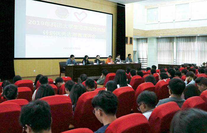 为进一步深化实施兵团大学生志愿服务西部计划项目,引导和鼓励更多的优秀高校毕业生参加兵团大学生志愿服务西部计划。4月8日,我校在惟行楼1501报告厅举办了“2019年兵团大学生志愿服务西部计划优秀志愿者宣讲会”。此次宣讲会由团委副书记沈嘉主持,各学院近200名毕业生代表参加。