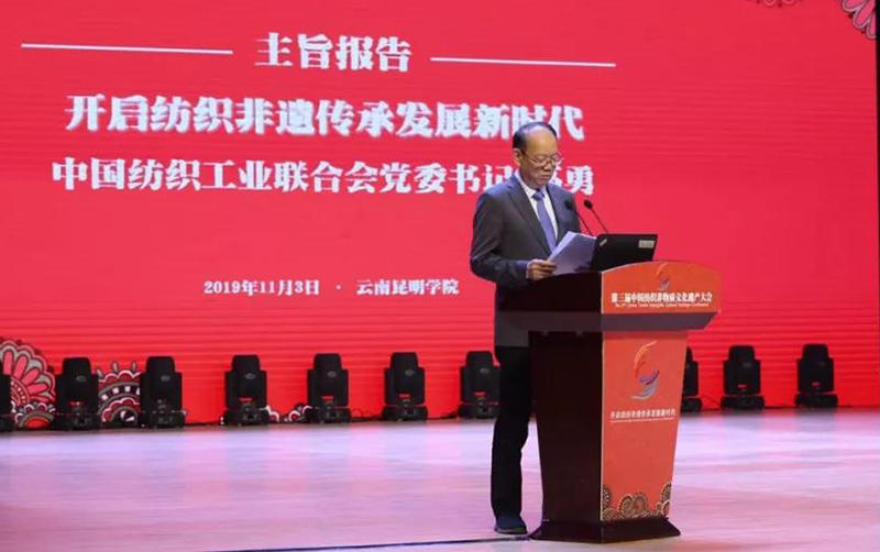 11月3日上午,第三届中国纺织非物质文化遗产大会在昆明学院学生会堂正式召开。会议由由中国纺织工业联合会副会长孙淮滨主持。文化和旅游部非物质文化遗产司副司长王晨阳,工业和信息化部消费品司副司长曹学军,北京首都创业集团有限公司党委副书记、董事、总经理李松平,昆明学院党委副书记、校长黎素梅分别致辞。多名业界专家围绕大会主题进行了主旨演讲,通过丰富的实践和鲜活的案例,交流了经验,提出了业界发展的战略构想。