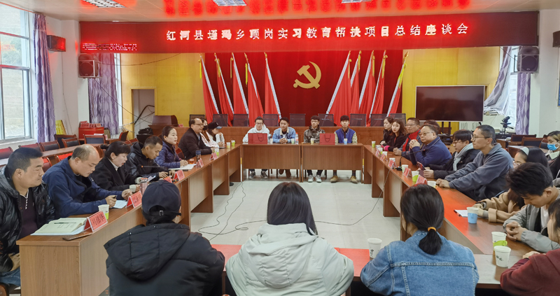 2020年12月31日,昆明学院红河县垤玛乡顶岗实习教育帮扶项目总结座谈会在红河县垤玛乡人民政府会议室召开。会议对2020年9月22日—12月30日期间昆明学院赴红河县垤玛乡开展顶岗实习教育帮扶项目的20名师范实习生实习情况作总结。