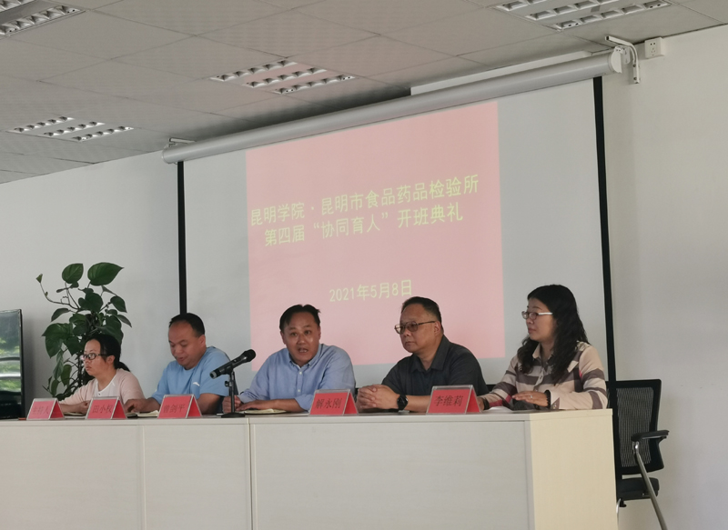 5月8日,昆明学院与昆明市食品药品检验所(以下简称“市检验所”)协同育人第四届开班典礼在昆明市食品与药品检验研究院举行。市检验所领导、各中心主要负责人、相关工作人员及任课教师,昆明学院教务处、化学化工学院相关负责人和2018级化学专业(食品与药品检验方向)31名学生等共同出席了开班典礼。