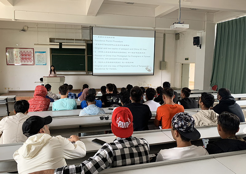 会上,国际学院外事科孔昭妮向留学生介绍《中华人民共和国出境和入境管理法》的重点条款及居留许可证办理手续,让入学新生知晓入境手续;学生科王婷向学生强调《昆明学院留学生管理规定》《昆明学院学生公寓管理规定》的一些重要内容,促使所有学生记住在校行为规范;教学科董丹晔给留学生再次强调上课纪律和《昆明学院学生学习管理规定》中的重要内容,令同学们的学习方向不再迷茫;项目科蔡琳给留学生介绍了即将开展的“昆明市2021年面向南亚东南亚国际技能人才专项培训”项目的相关内容,大家对国际学院的全面能力素质教育由衷赞叹。