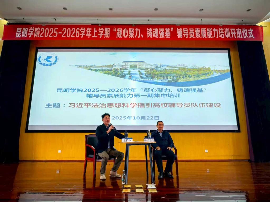 为深入贯彻落实习近平法治思想,全面提升辅导员队伍的法治素养和育人能力,10月22日下午,昆明学院2025-2026学年上学期“凝心聚力、铸魂强基”辅导员素质能力培训开班仪式在惟行楼1501会议室举行。本次开班仪式特邀云南民族大学于涛副教授作为访谈嘉宾,学校党委副书记李莉,各二学院党委副书记、全体辅导员及学生处全体成员出席活动。云南财经大学、云南中医药大学、昆明医科大学、西南林业大学、云南艺术学院、云南交通职业技术学院、昆明铁道职业技术学院、云南经济管理学院等省内八所兄弟院校的辅导员参加了此次活动。
