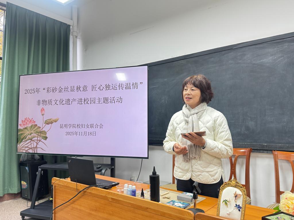 11月18日下午,一场以“彩砂金丝显秋意 匠心独运传温情”为主题的非物质文化遗产进校园主题活动在昆师路校区举行。学校党委委员、党委副书记、校妇联主席李莉出席活动并讲话,她希望通过此次活动的开展让大家感受非物质文化遗产魅力的同时,让这些珍贵的文化技艺能在师生们的手中得以传递,在校园里扎根。