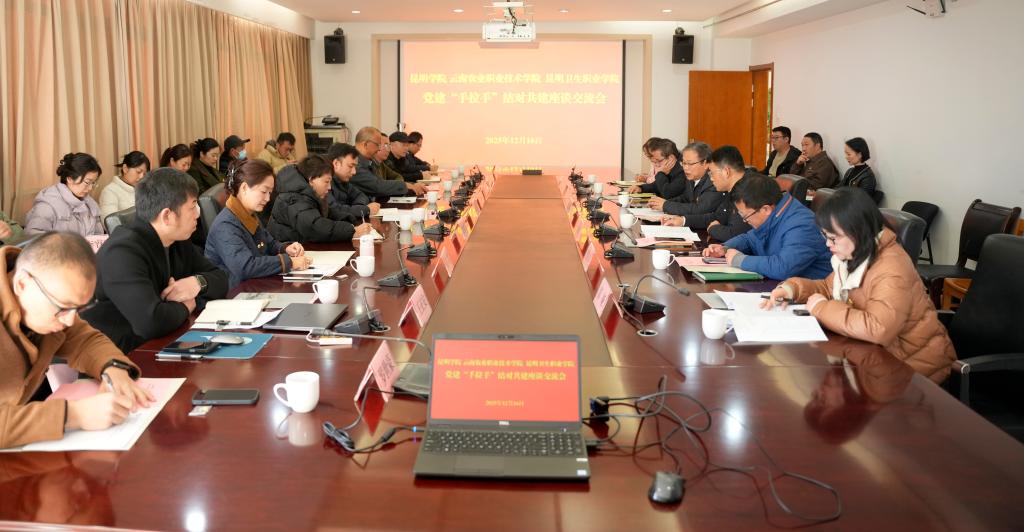 12月16日上午,我校与云南农业职业技术学院、昆明卫生职业学院开展党建“手拉手”结对共建活动,进一步加强校际党建交流与合作,共同探索高质量党建引领高质量发展的有效路径。学校党委副书记王文成、云南农业职业技术学院党委副书记孙继先和昆明卫生职业学院党委书记(督导专员)马季昕,党委副书记、院长龙雨霏出席活动。