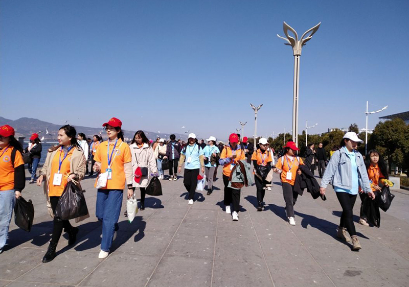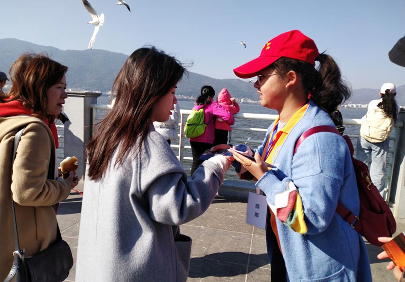 志愿者们到达海埂大坝,沿大坝捡拾垃圾,向附近的游客介绍红嘴鸥的相关知识,赠送他们昆明学院的明信片留作纪念,号召大家爱护红嘴鸥,共同为美丽的红嘴鸥创造一个良好的生存环境。