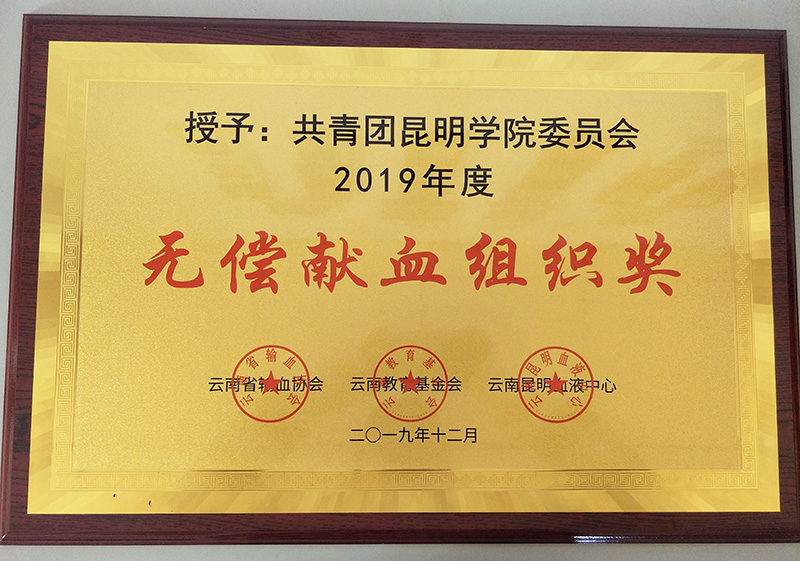 2019年,校团委联合昆明市血液中心共组织7次无偿献血活动,2100余名师生参与,献血总量达704980cc。通过无偿献血活动,进一步增强了我校师生参与无偿献血公益事业的意识,培养了志愿服务精神,使每一位在校大学生在学业丰收的同时不忘奉献他人,造福社会。
