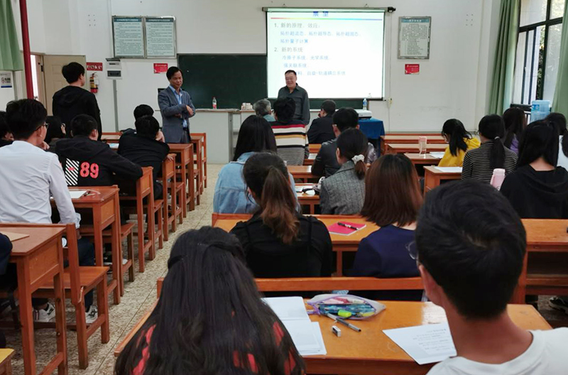 刘伍明研究员详细讲解二维材料拓扑量子态,例如拓扑超导、拓扑超流、拓扑量子相变、强关联拓扑效应、反常量子Hall效应、自旋Hall效应等新奇量子态和量子效应,号召我校硕士研究生继续攻读博士研究生。这次学术报告不仅使学生和教师在知识方面受益,而且也激起师生的科研激情。报告现场,刘伍明研究员与全体师生进行热烈互动,氛围活跃。