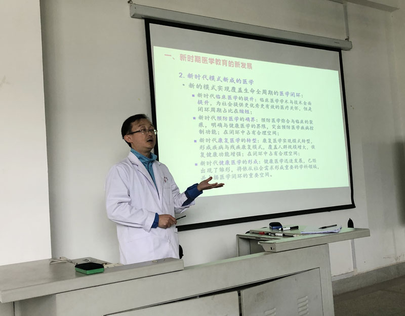 陶剑副院长向全体教职工传达10月17日在河南郑州召开的全国综合性大学医学教育学术年会的主要精神。陶剑副院长以原首都医科大学校长吕兆丰教授在大会上的讲座内容为蓝本,从中国高等医学教育发展历程及改革方向、全国高等医学教育的发展现状、综合性大学医学教育的模式及现状,面临的问题及解决思路四个方面详细的介绍了会议精神,结合医学院现状分析了存在问题的原因。作为中专卫校合并综合性本科院校而建立的二级医学院,我们和全国其他同类医学院存在相同的问题:办学模式不规范及师资中专教育思维尚未得到根本转变的问题。