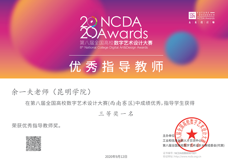 9月12日,在工业和信息化部人才交流中心主办的第八届全国高校数字艺术作品大赛(NGCA)比赛中,昆明学院建筑工程学院团总支书记余一夫老师荣获优秀指导教师奖,李可、朱鹏飞同学作品在“走进寻乌”命题赛中荣获西南赛区三等奖,张海滨同学在“走进耀州”命题赛中荣获西南赛区三等奖。