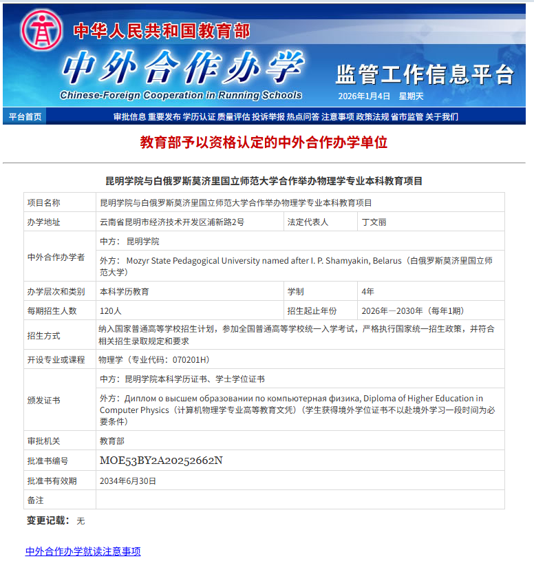 近日,昆明学院与白俄罗斯莫济里国立师范大学联合申报的“昆明学院与白俄罗斯莫济里国立师范大学合作举办物理学专业本科教育项目”成功获教育部批准。项目的获批标志着学校在国际化办学领域实现里程碑式突破。