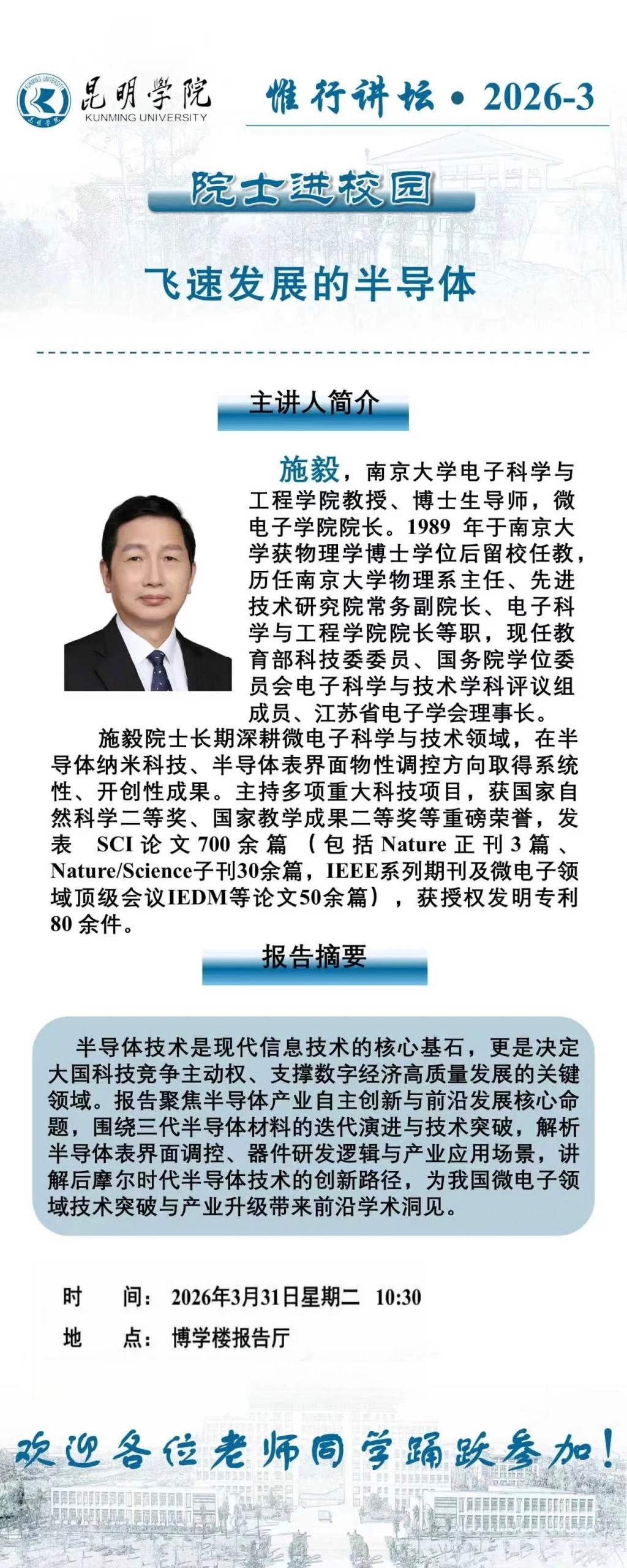 【讲座预告】施毅院士主讲惟行讲坛《飞速发展的半导体》